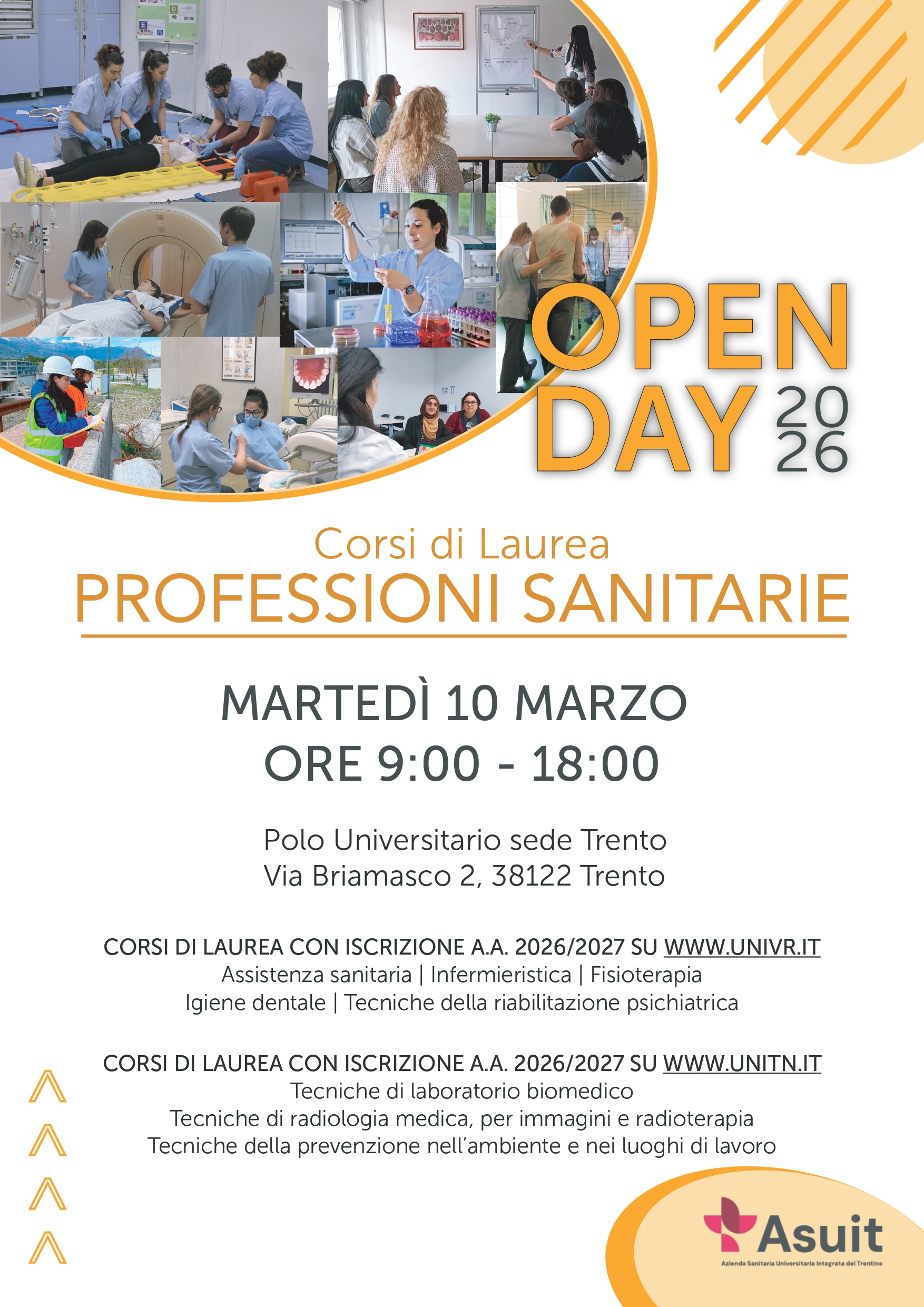 Open Day 2026 dei Corsi di Laurea delle Professioni Sanitarie - martedì 10 marzo 2026 nella fascia oraria dalle 09:00 alle 18:00 presso il Polo Universitario delle Professioni Sanitarie di Trento in via Briamasco, 2 - Trento (ex Trento Fiere)